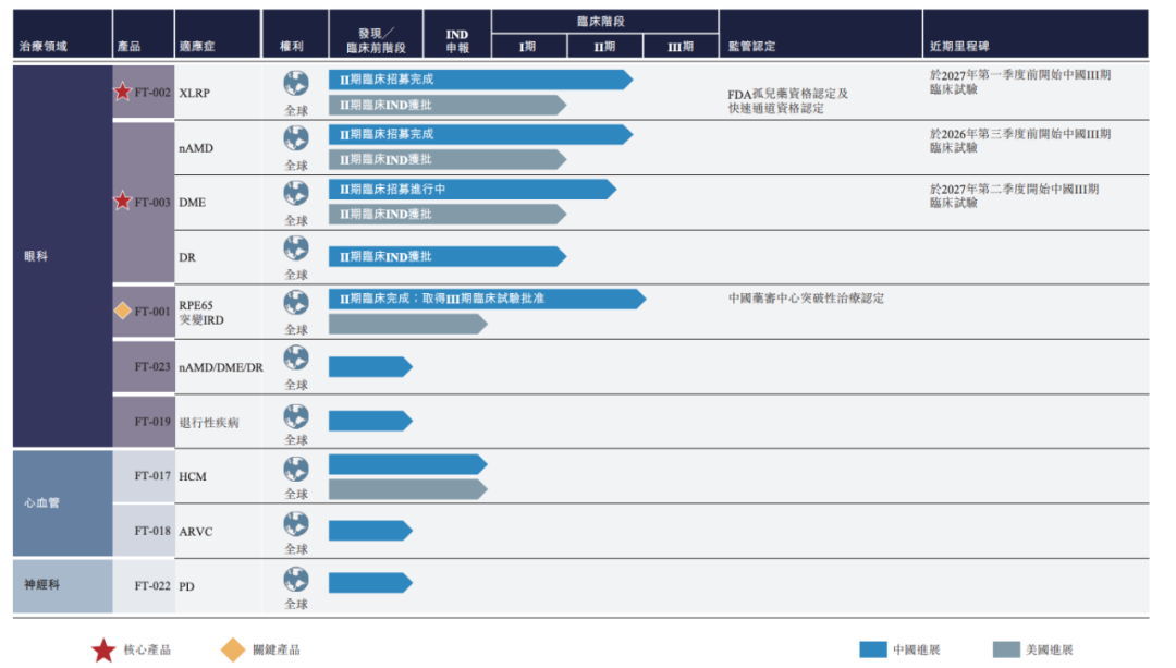 FT-002用于治疗X连锁视网膜色素变性(XLRP),是中国唯一进入临床阶段的同类疗法。XLRP是最常见且最严重的遗传性视网膜疾病之一,目前全球尚无获批的针对性疗法,存在巨大的未满足临床需求。FT-002 2024年先后获得美国FDA授予的孤儿药资格认定与快速通道资格认定。目前,FT-002正在中国开展II期临床试验,并已获FDA批准在美国推进II期临床。