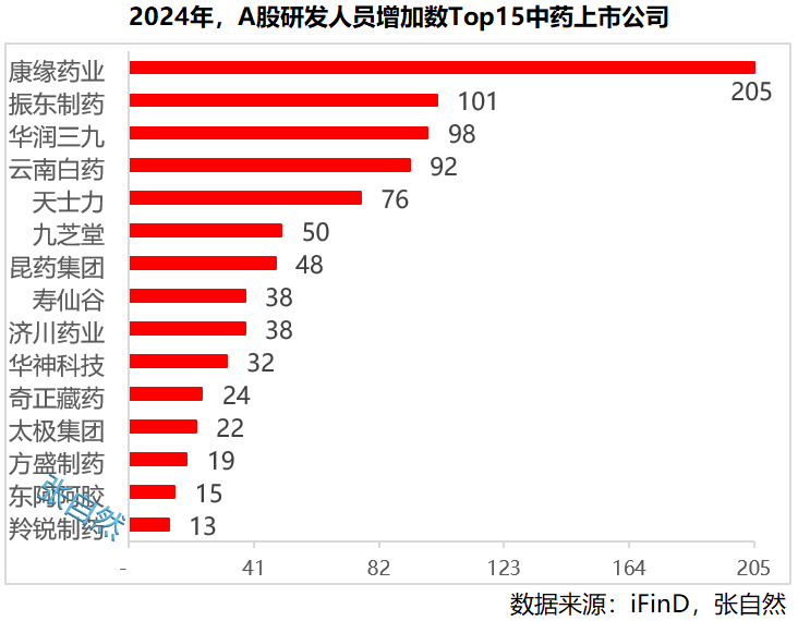 2024年,65家中药上市公司中,研发人数超过300人的有26家(占40%)、超500人的12家(近1/5)、超千人的只有2家。